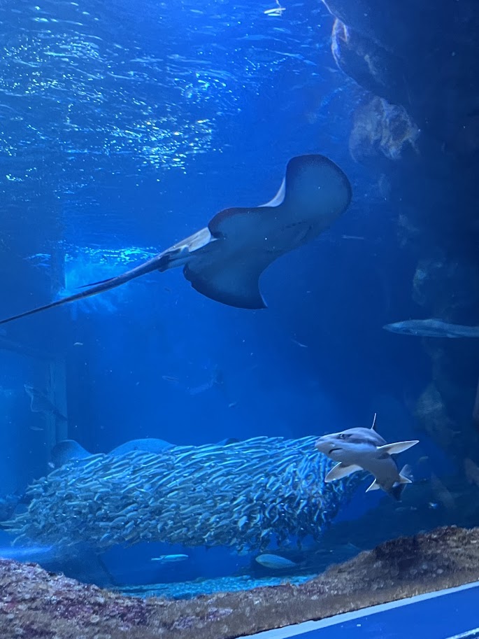 名物のトンネル水槽では、頭上を泳ぐエイやサメに子どもたちも「わぁ~!」と吸い寄せられます。